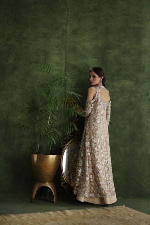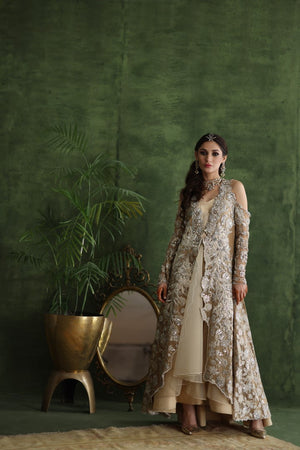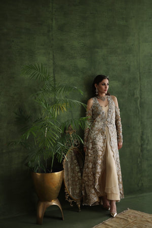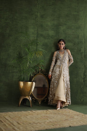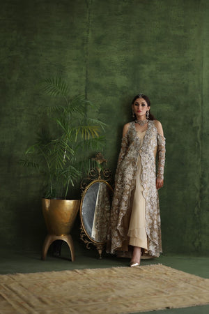 Front open style in overall embroidered canvas captures the essence of an epoque style, blending vintage charm with contemporary flair. The dress has Vintage coffee colour with hint of ivory work,front scalop detailing embellished with pearls, stones,silver resham. Sleeves elegantly reveal the shoulders, embracing a modern aesthetic to the overal look. Comes with inner.