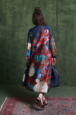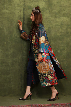 Long front open jacket, Beautiful Turkish inspired print on silk fabric, Embroidered Jacket & print is enhanced with gorgeous resham work. Golden fabric applique work on the print.
