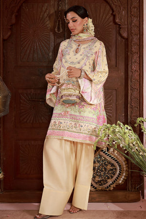 This short kurta features a modern take on a Hyderabadi neckline, paired with a farshi shalwar and bell sleeves. Embellished with colourful moti, cutdana, nalki, tiki stones, sitara, and pearls. Styled with a printed dupatta with light touches of handwork.