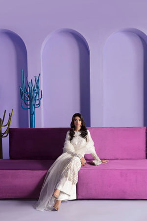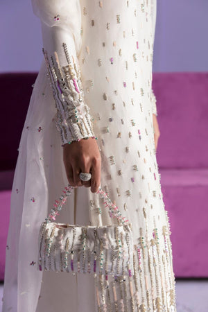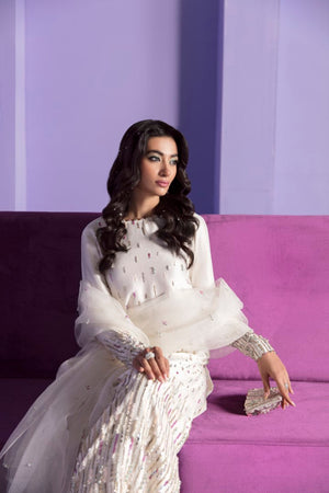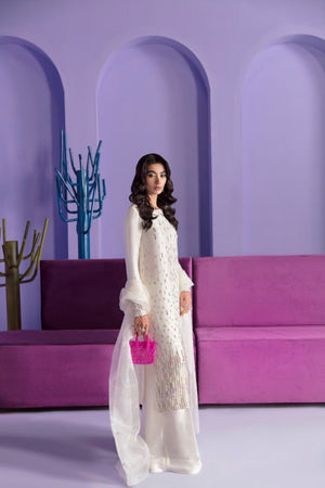 Celeste is adorned with hand embellishments in crystals and French sequins, adding a touch of sparkle and shine. The raw silk straight shirt has a sleek and sophisticated silhouette, with clean lines and simple details that allow the hand embellishments to take center stage. The flared pants are both stylish and comfortable, with a flattering fit that complements the shirt perfectly. The organza dupatta adds a touch of elegance, with a sheer and delicate fabric that drapes beautifully over the shoulders.