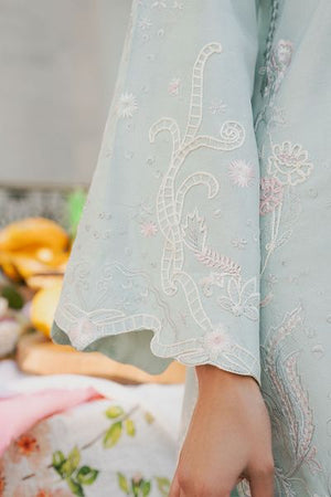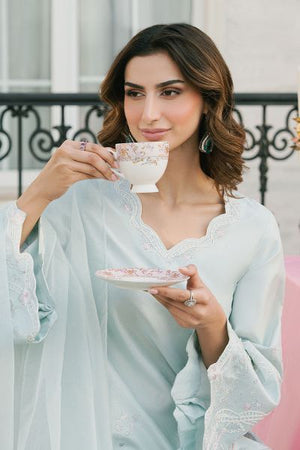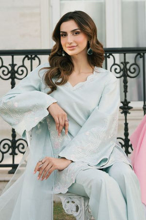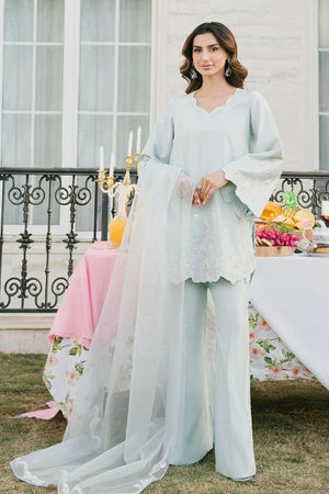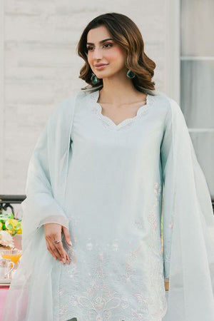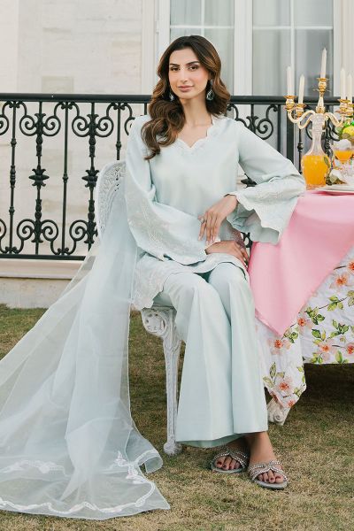 This refreshing ice blue outfit captures the essence of cool elegance and modern style. The short shirt, with its crisp and clean silhouette, brings a fresh and vibrant vibe, while its subtle design allows the soft ice blue color to take center stage. Paired with boot-cut pants, the ensemble adds a flattering shape, offering both comfort and a chic, elongated look. Draped over the shoulders is a beautiful organza dupatta, its delicate, airy fabric adding an ethereal touch to the outfit. The overall look is light, sophisticated, and effortlessly stylish, perfect for a spring or summer event.