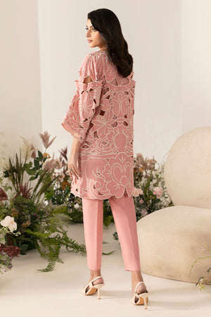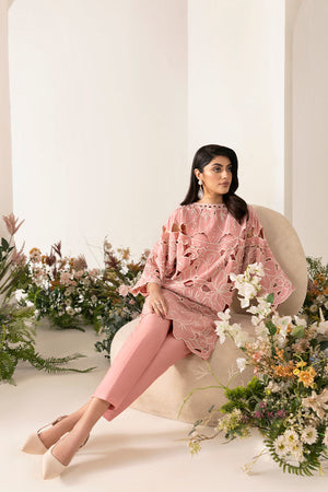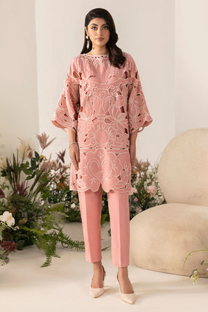 This baby pink short shirt ensemble has beautiful cutwork thread embroidery in off white color.