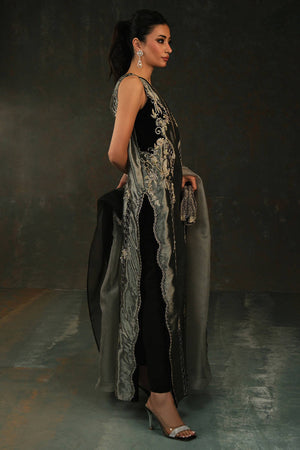 A statement in celestial grandeur, this silhouette pairs luminous silver tissue with deep black velvet, adorned in exquisite hand-worked tilla, dabka, cutwork and resham embroidery. Finished with an embroidered organza, two toned dupatta, the look blends old-world craftsmanship with a modern, sculptural form. Comes with pants.