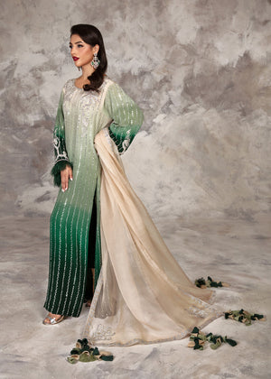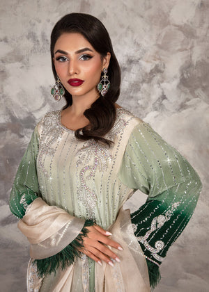 Step into the shades of green as we unveil our show stopper ensemble. An airy pure grip shirt glistening with precious stones adorned with intricately detailed archival hand work of naqshi, dabka, sequince and stones with feather embellishments on the sleeves creating a mesmerising effect. To complete this magical look, a pure organza dupatta, with intricate hand work on all four sides steals the spotlight, adorned with captivating tassels. Paired with blended silk pants. Revel in the festive spirit in this beauty.