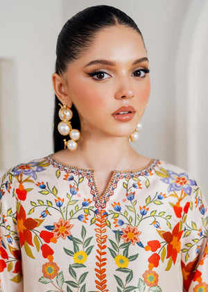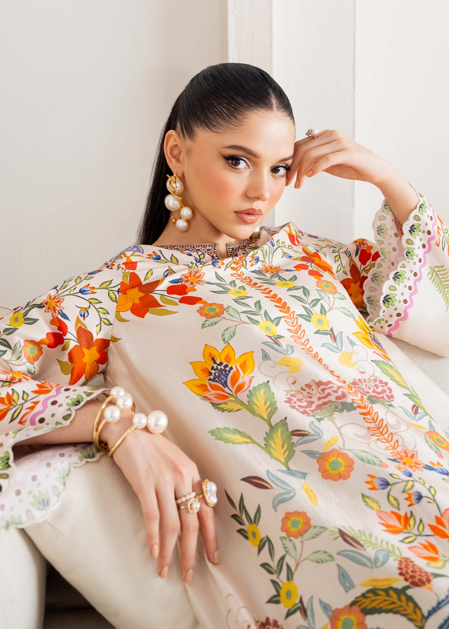 Step into sophistication with this stunning Pure Raw Silk Outfit, meticulously crafted for those who appreciate the finer details of design. The off white base is beautifully adorned with vibrant, multi-colored floral motifs that bring an air of richness and vibrancy to the piece. The ensemble features exquisite embroidery on the neckline and delicate embroidered scallops on the hem and sleeves, adding an elegant touch to the fluid, luxurious fabric. Made from premium raw silk, this outfit drapes effortlessly for a flattering fit and elevated style. this look is perfect for day-time events.