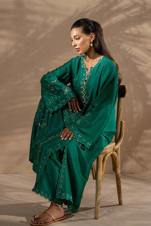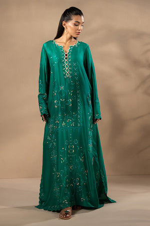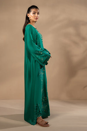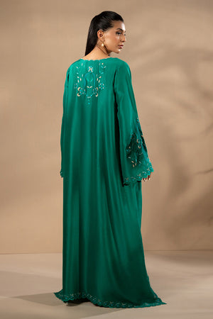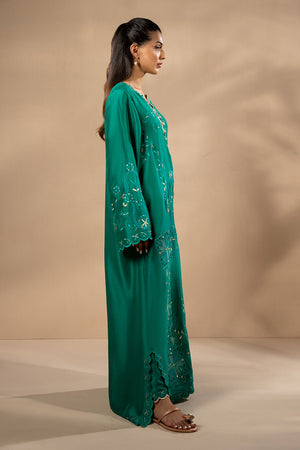Rendered in a deep emerald hue, this fluid silhouette is adorned with intricate cutwork embroidery and artisanal stitch detailing. The kaftan, crafted from luminous pure raw silk, is paired with tonal straight pants to create an effortlessly elegant ensemble.
