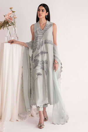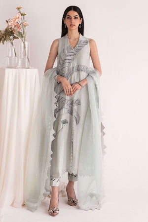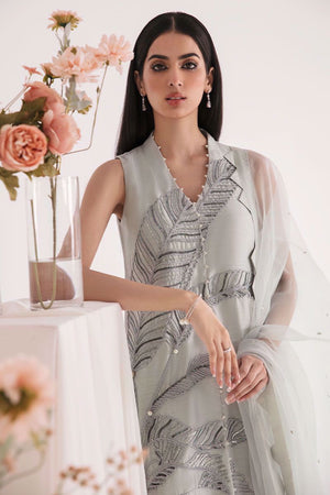 This classy ice-blue raw silk straight shirt is designed with dori sequin and pearl detailing on the edges. It is paired with straight raw silk trouser and an organza dupatta completely sprayed pearl with scalloped dupatta on all four sides.