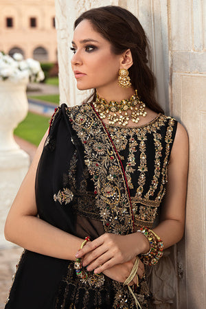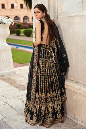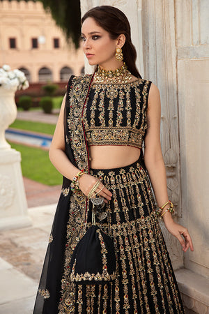 Chandni the head turning classic black lehnga choli is fully hand crafted with dabka, sitara, and resham details. The Korean silk outfit is paired with organza dupatta with intricate details of zardozi and motifs spray.
