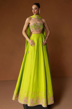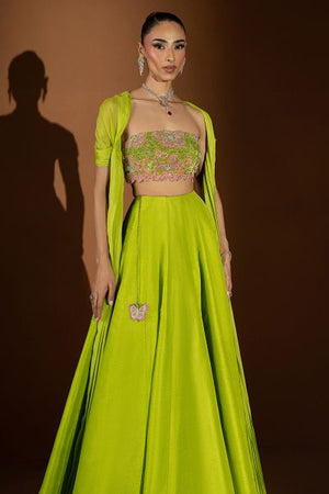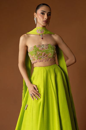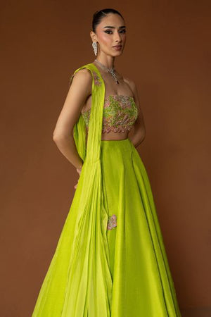 Reflecting the vivacity of festive hues, Chantelle is rendered in a striking parrot green tone; the blouse is carefully adorned with delicate embellishments and subtle pink accents that lend a touch of femininity. Paired with graceful detailing, the whole look beautifully balances vibrancy and refinement, perfect for moments that call for celebration.