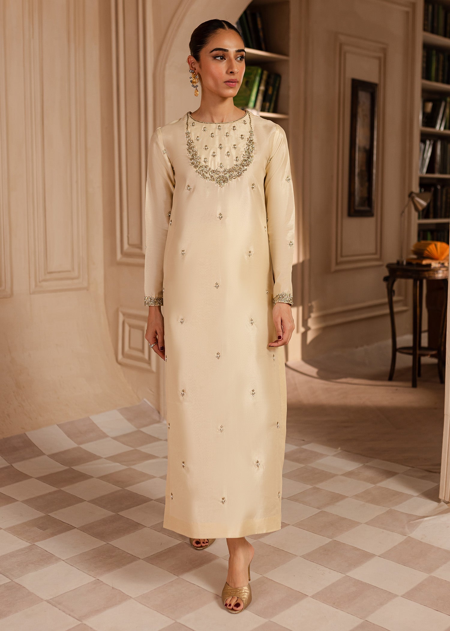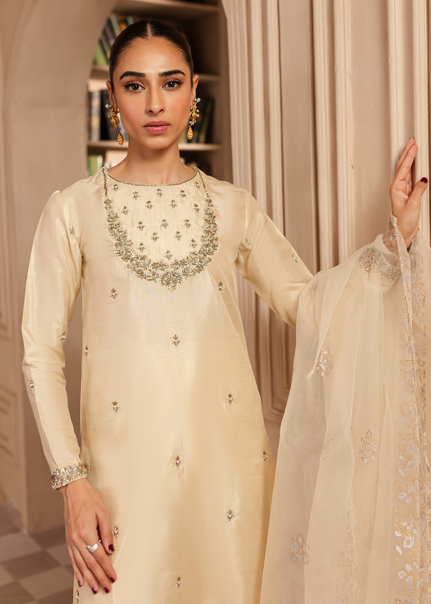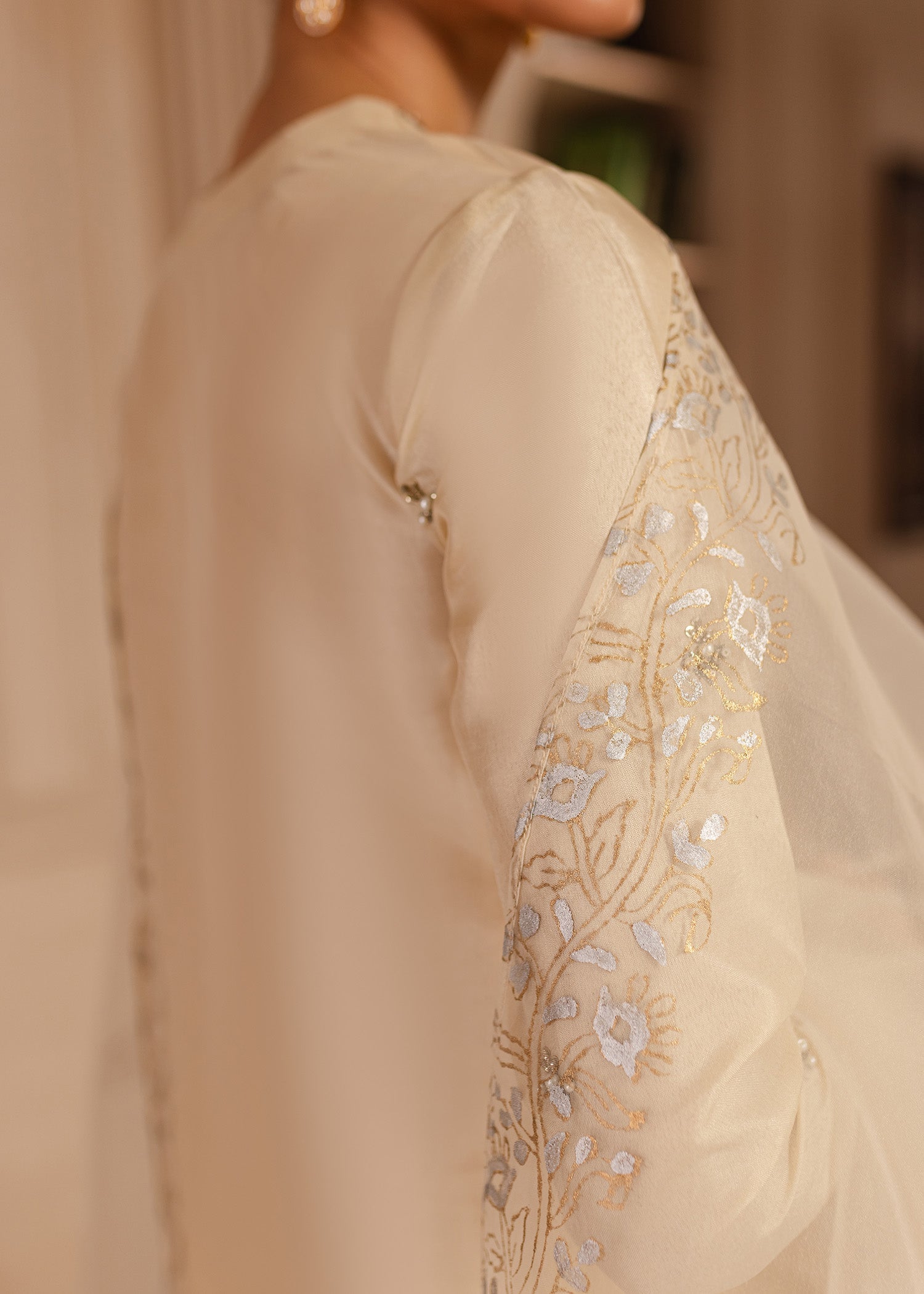Charlie - features an elongated shirt adorned with intricate hand work beautifully crafted floral motifs with hints of sliver, light gold and antique. Comes with an block printed organza dupatta & paired with beautiful straight pants making this illuminating outfit, perfect for an elegant formal look.