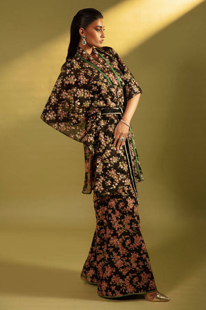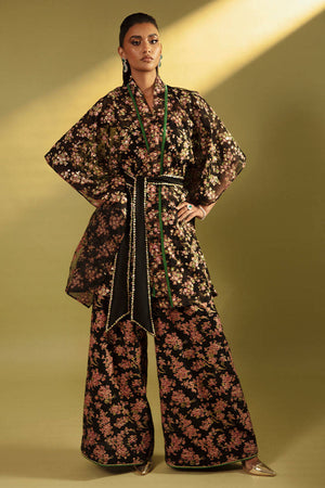 An eye-catching printed heavily embellished wrap with stunning embellished belt. Paired with printed flared pants.