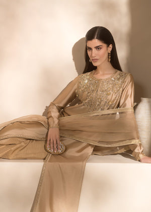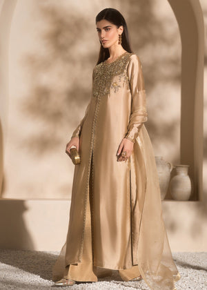 A stunning gold front-open shirt with a beautifully embellished neckline, paired with bootcut pants and a dupatta featuring intricate booti work.