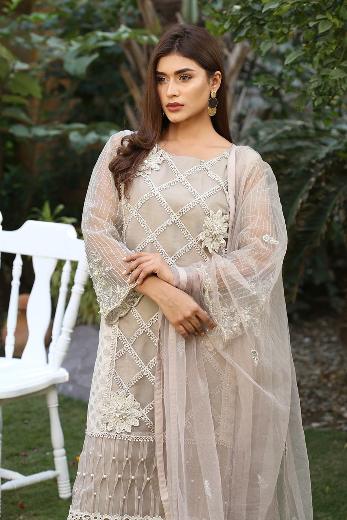 - Straight Cut Organza Shirt Featuring Embellished Net sleeves with handwork of pearl stones and crystals. Shirt is adorned with laces and embellished 3D Flowers. Lace Detailed Pleated paints and mirror embellished motif work on Dopatta complete the look of this suit