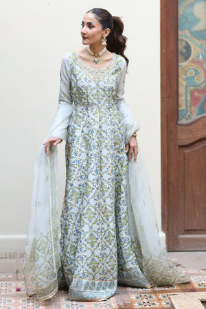 A captivating discharge print in rich hues of blue, with exquisite gota and zardozi handwork, on a luxurious khaddi silk kalidaar. Paired with straight pants and an organza dupatta, adorned with a complementary discharge print and subtle gota accents.