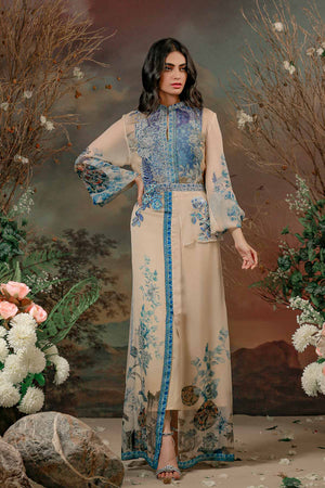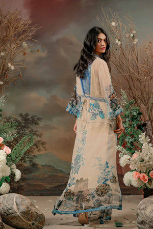 Easy breezy modern shamaeel pure chiffon silhouette features artfully composed beautiful flowers in shades of cobalt blue hues on ivory textural canvas. it features beautiful satin stitch silver tila thread intricate embroidery on delicate floral print. breathtaking handcrafted floral embroideries in shades of blues and ivory resham thread enhanced with delicate handcrafted silver zardozi embellishment.Collection: Guzel Eid Collection 2021
