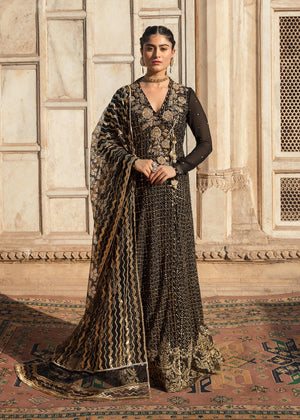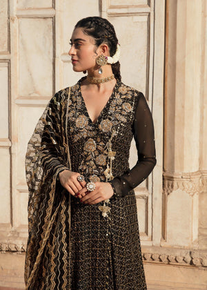 The beautiful angrakha is made in pure Korean chiffon with gold tilla and sequins work all over. The anghrakha has hand work around the neck and is paired with straight pants. The look is completed with heavy sequin worked net dupatta.