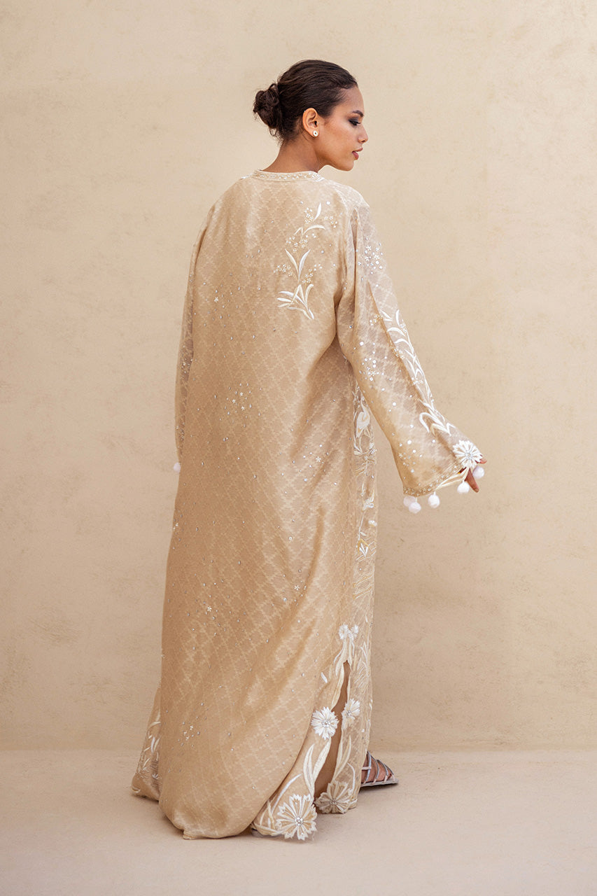 Bathed in a muted sand hue, a kaftan in self embossed cotton net is adorned with ivory resham embroidery, delicate botanicals unfolding across its length, glimmering with subtle sequins. The neckline and side slits bloom with floral resham cutwork while tasseled pompoms accent the cuffs and placket, adding a touch of whimsy.