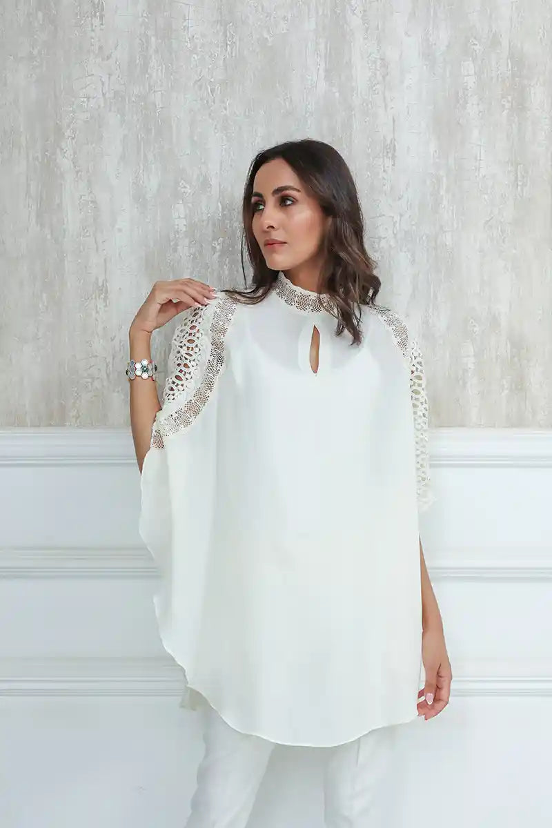 Chloe represents elegance redefined with a touch of opulence. A matte ivory color with a flowing crepe georgette fabric cut in the design of a circular poncho to give a flowing look and shoulders embedded with lace cut outs.