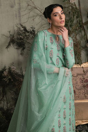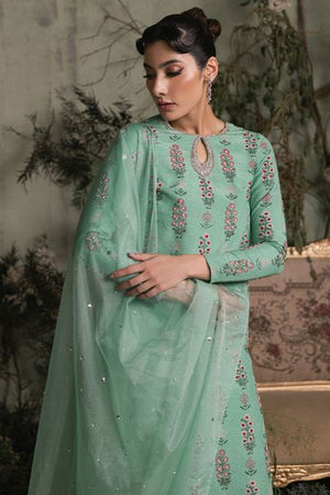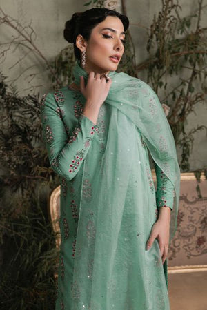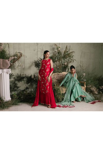 Make a stunning statement with this breathtaking green Cloris outfit, featuring intricate screen printing and vibrant red French knots. Delicate embellishments add a touch of luxury, while the flowing sharara pants create a dramatic silhouette. The accompanying dupatta boasts a mesmerizing three-color appliqué design, elevated by dazzling diamantes. This masterful ensemble seamlessly blends traditional craftsmanship with modern flair, perfect for formal events, weddings, or cultural celebrations.