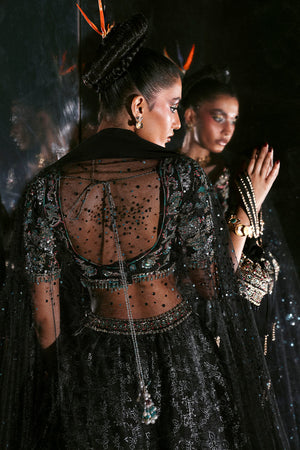 An effortlessly captivating black ensemble featuring a deep neck blouse, intricately hand-embellished with florals using naqshi, dabka, and sequin work. The sleeves are adorned with delicate floral motifs and a finely detailed border. Paired with a stunning block-printed lehnga, gathered at the waist, complete with an embellished belt and can-can for volume. A net dupatta complements the look with contrast sequin spray, floral bunches at the ends, and a black border finish, adding a touch of elegance to the entire outfit.