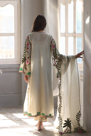 The epitome of effortless grace, a khaddi corduroy shirt in the lightest hue of celadon is intricately embroidered with vibrant botanical and palm motifs. The relaxed silhouette is complemented with matching pure rawsilk scalloped trousers. Paired with a cascading organza dupatta featuring botanical sprigs embroidered on the scalloped borders and playful pompom accents.