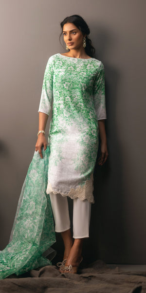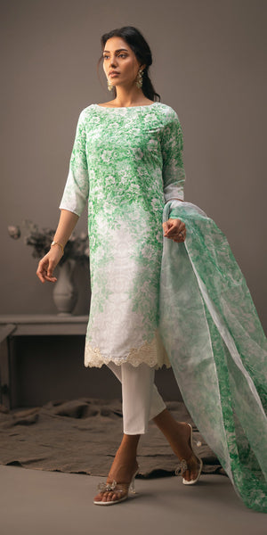 Introducing a chic ensemble in flowy grip georgette, featuring a mid-length boat neck shirt with intricate corner embroidery on the daman. Paired with sleek grip trousers for a refined look, the outfit is completed with a beautifully blended organza dupatta, adding a touch of elegance and grace.