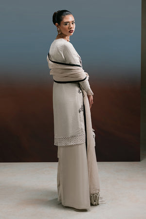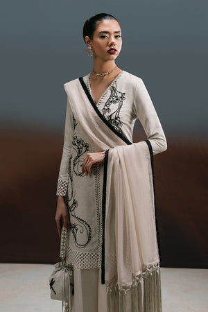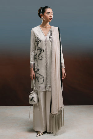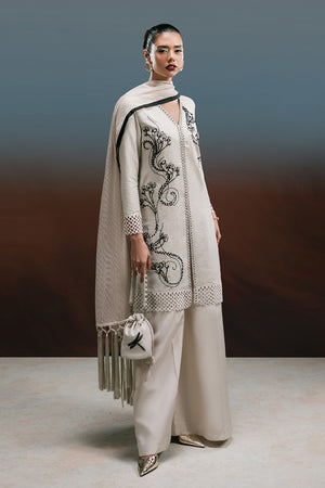Soft, serene, and effortlessly chic, Cloudy is a vision of timeless sophistication in off-white. This self-karandi V-neck shirt, with a delicate short front slit, is adorned with exquisitely embroidered and embellished florals, seamlessly blending into a gracefully detailed embellished border. The cutwork embroidered daman and sleeves add a refined touch, while the loose-fit Thai silk trousers ensure effortless movement and elegance. Completing the look, the cotton net dupatta, accentuated with contrast edging and handmade tassels, adds the perfect finishing touch to this ethereal ensemble.