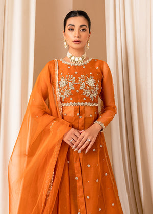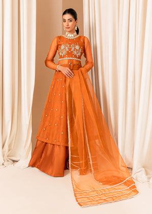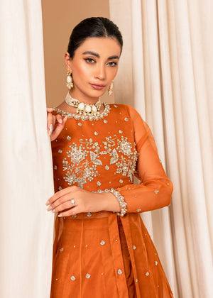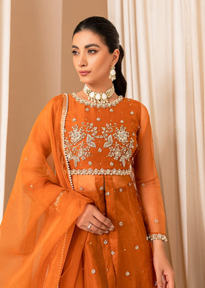 A beautiful Burnt orange heavily embellished organza bodice with floral motifs detailed with sequins, cutdana and pearls. Paired with raw silk lehnga. Completing the look with organza dupatta with heavy borders.