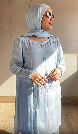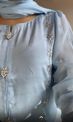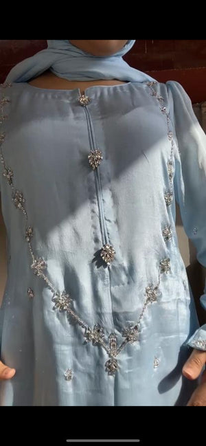 A modern cut 3 piece stitched dress with delicate crystal embroidery and embelishments on shirt paired with flappers intricated with