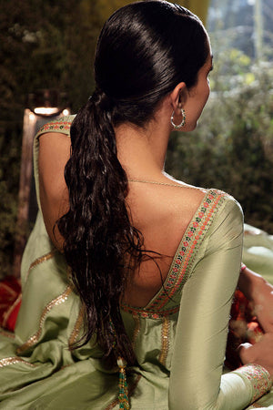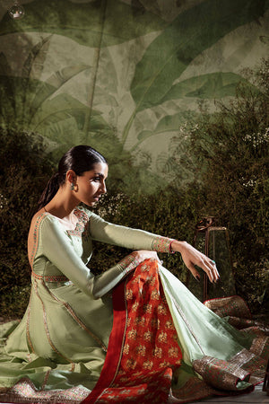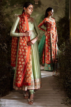 An eye-catching mint green kalidaar with embellished motif on neckline and stunning embroidered borders on hem, paired with churidar and completed with rust screen printed dupatta.