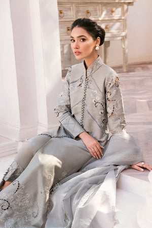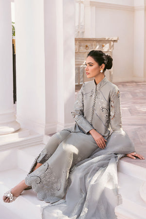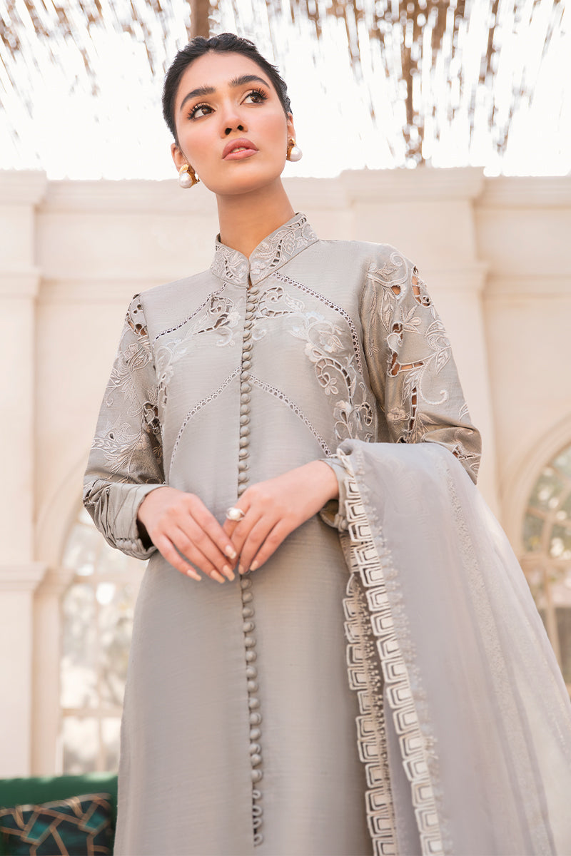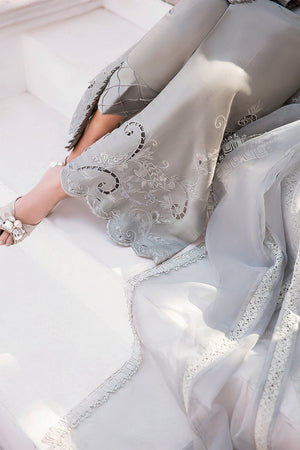 Impeccably constructed and richly embroidered cutwork with silk thread on a canvas of grey, korean raw silk. Our ensemble is a sure show stopper. Complete ensemble with beautiful organza dupatta with lace detailing.