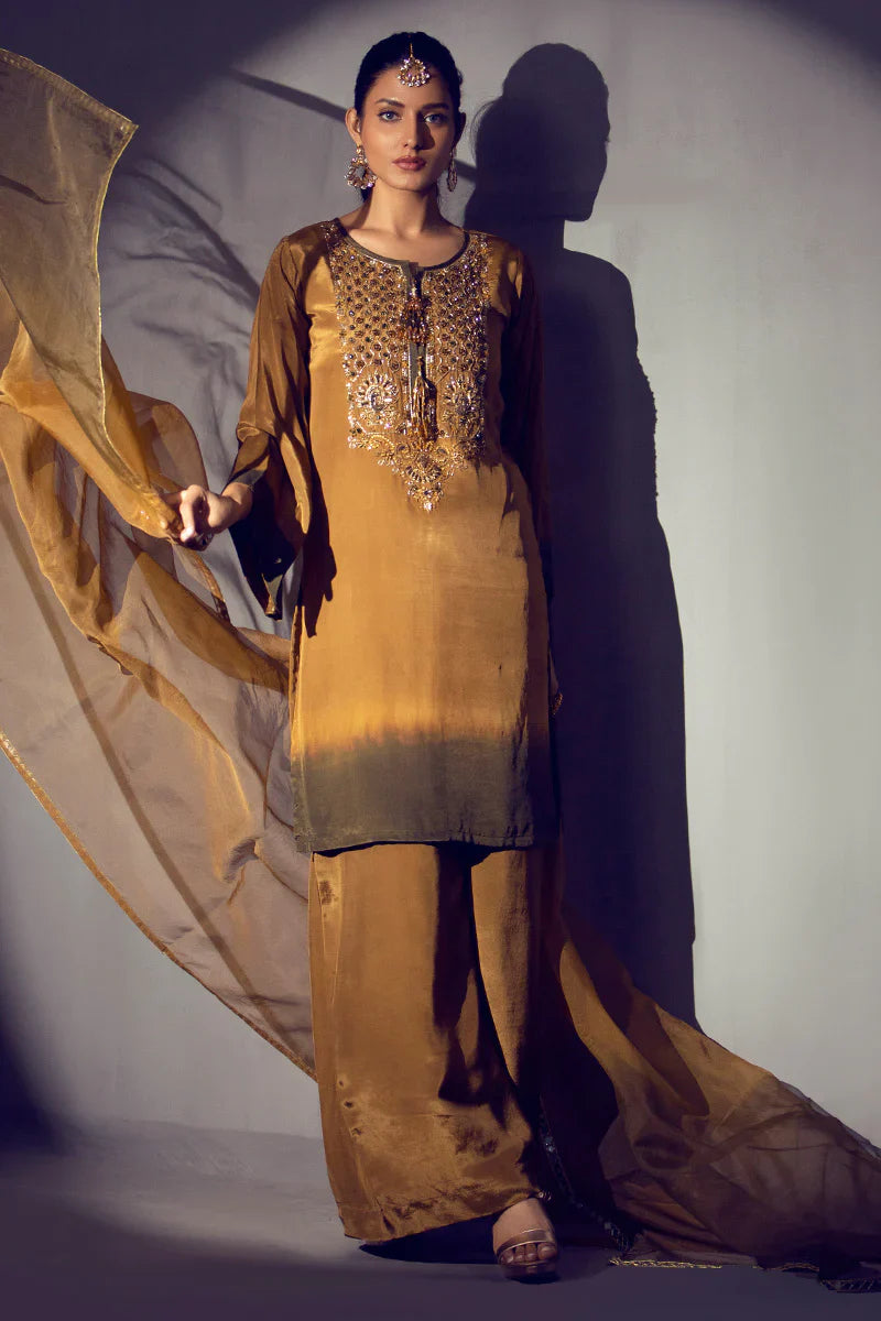 Premium tie and dye Russian silk shirt embellished with handwork of naqshi, pearls, kora, dabka and crystals paired up with tie and dye dopatta and wide leg plazzo pants. Length of shirt is 38 inches and plazzo is 42 inches.Model is wearing size small and her height is 5'8. Weight of this product is 1 kg