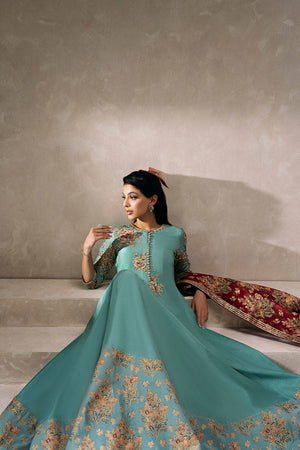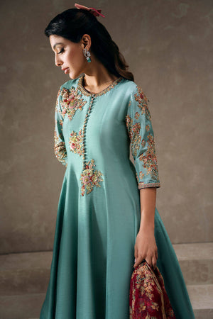 An exquisite sea green kalidaar featuring a striking design with intricately embellished motifs at the neckline, complemented by printed three-quarter sleeves to enhance the outfit's overall elegance. The hem is adorned with printed borders, adding a refined touch. The kalidaar is paired with a contrasting hot pink printed dupatta and plain sea green pants, creating a sophisticated and harmonious ensemble.
