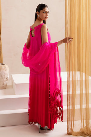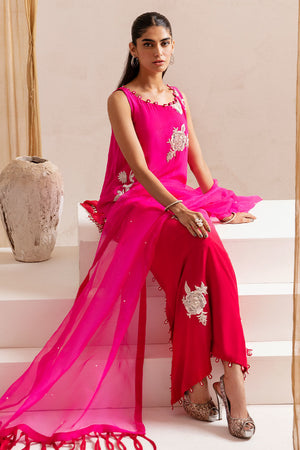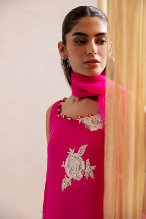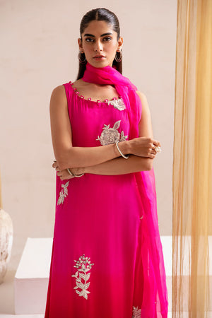 The dress is adorned with contrasting white floral embroidered motifs, elegantly enriched with delicate pearl details. The shirt has a boat neckline with pearls and loop details. To complete the look, pair it with our straight pants, and the accompanying dupatta features loop details on the pallu, ensuring a well-coordinated and fashionable look.