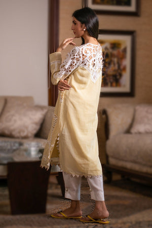 Hand crafted cut work, intricate lace work, leather appliqués and silk thread embroideries. This kurta is a master piece with a variety of textures and ornamentation.Fabric: Silk