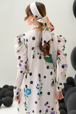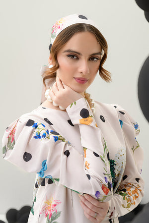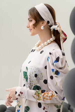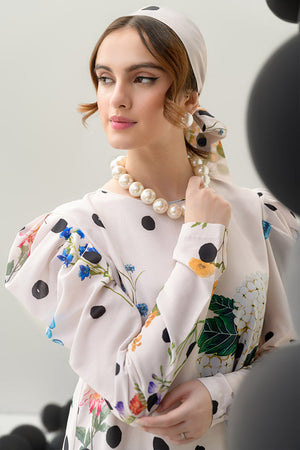 - Long shirt with mutton sleeves and charming off-white polka dots