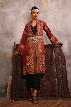 This exquisite jacket showcases a stunning fusion of traditional Oriental design and modern elegance in digital printed silk fabric. The front is embellished with combination of zari and resham embroidery. A central feature of the jacket is the thoughtfully designed opening adorned with an embellished motif. It comes with inner. Comes with straight pant to complete the look. Can be made inner & Pant in any Colour.