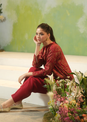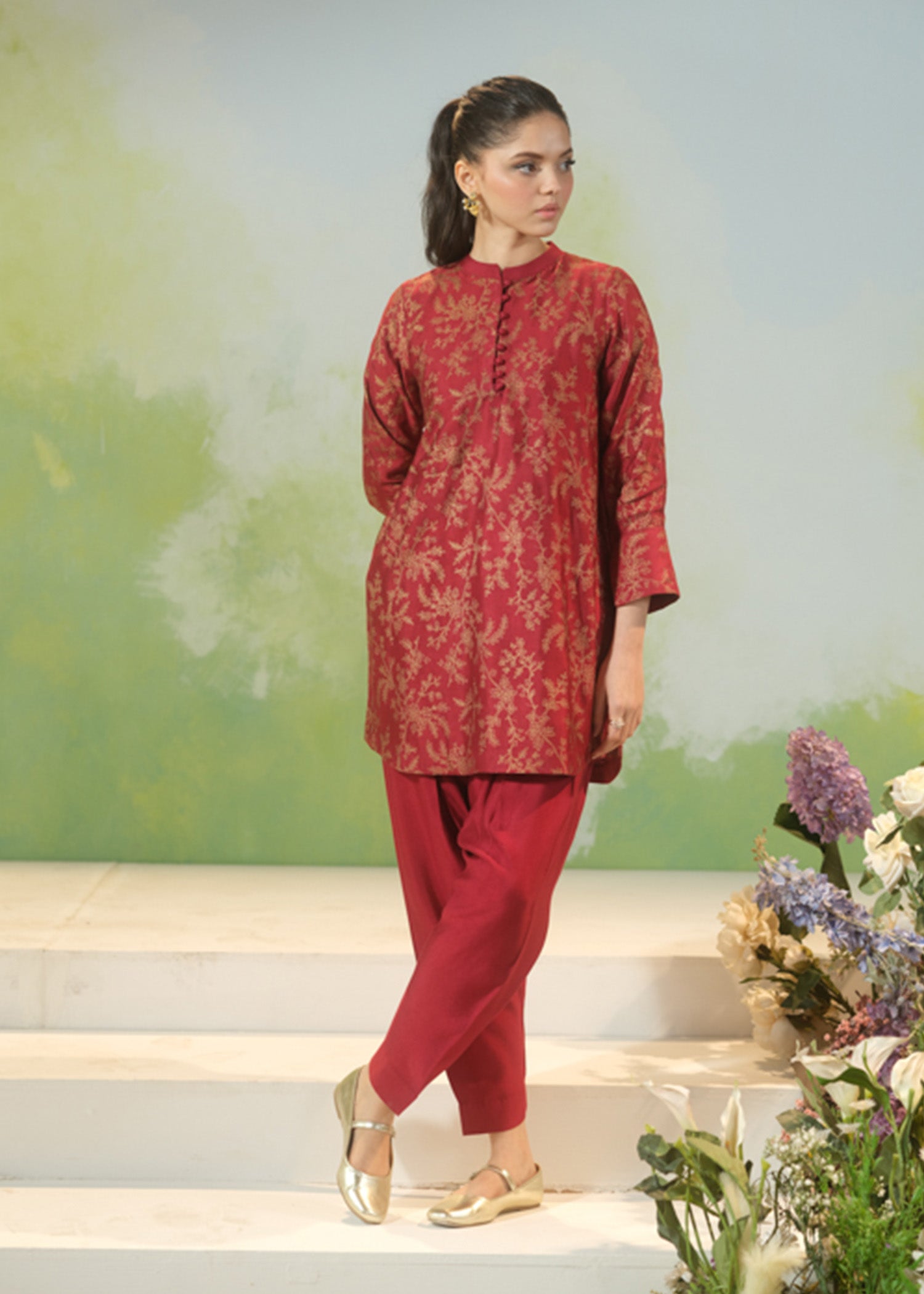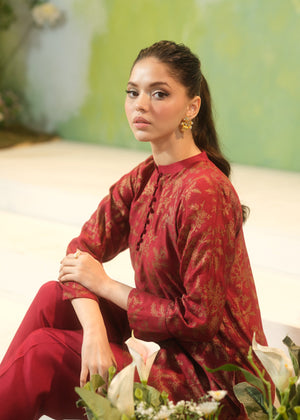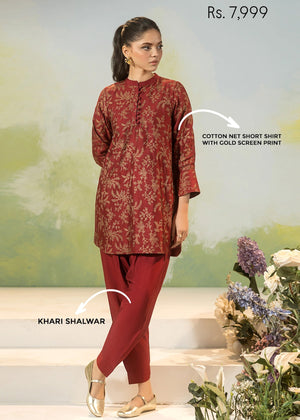 This exquisite maroon cotton net outfit is adorned with beautiful gold screen prints, creating a stunning contrast of rich hues. The delicate fabric adds a touch of lightness, while the intricate gold detailing enhances its regal appeal. The outfit is paired with a traditional Khari Shalwar, offering a perfect balance of modern elegance and classic charm.