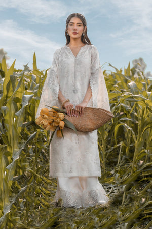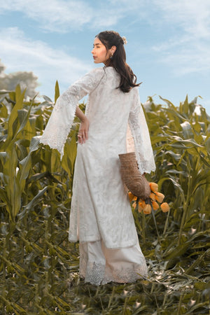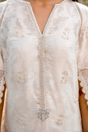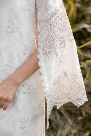 A white self khaddi net long shirt with embroidery, crystal and sequence embellishments completed with embellished bell slit sleeves. paired with embroidered sequence palazzo pants.