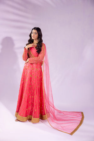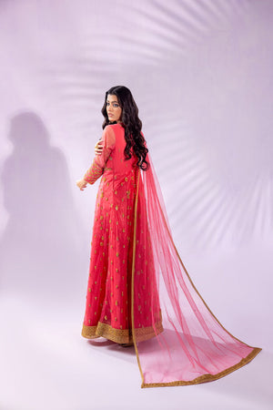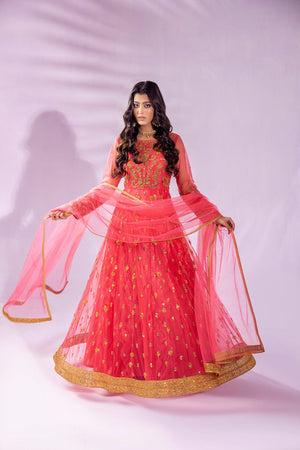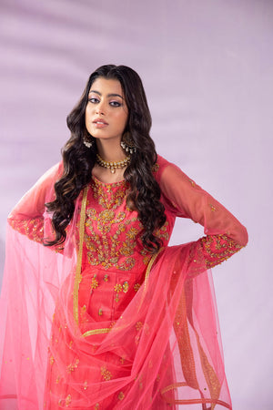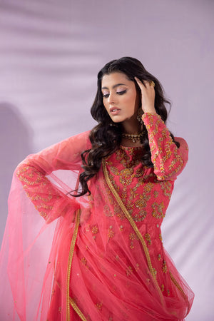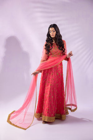 This ravishing pishwas is rendered in a beautiful shade of pink composed on pure net with an intricate and exquisite detailed adda work of sequins, beads, nakshi and dabka makes truly an artwork. Pure net body adds a touch of ethereal charm, elevating the ensemble to new heights of elegance. To complete the look paired it with net dupatta composed of heavy chatta in the middle and four sides border gives an ethnic regality.