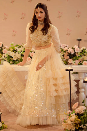 Premium organza blouse adorned with handwork of kora, dabka, resham and crustal hangings styled with three quarter puff sleeves paired up with net lehnga which is adorned with handwork of resham, sequin and cutdana beautified with net frills. It comes with pearl net dopatta adorned with net frills.Length of blouse for sizes xsmall to medium is 14 inches for sizes large to xxlarge length will be 15-16 inches. Lehnga length will be 43 inches for all sizes. Model is wearing size small and her height is 5'8