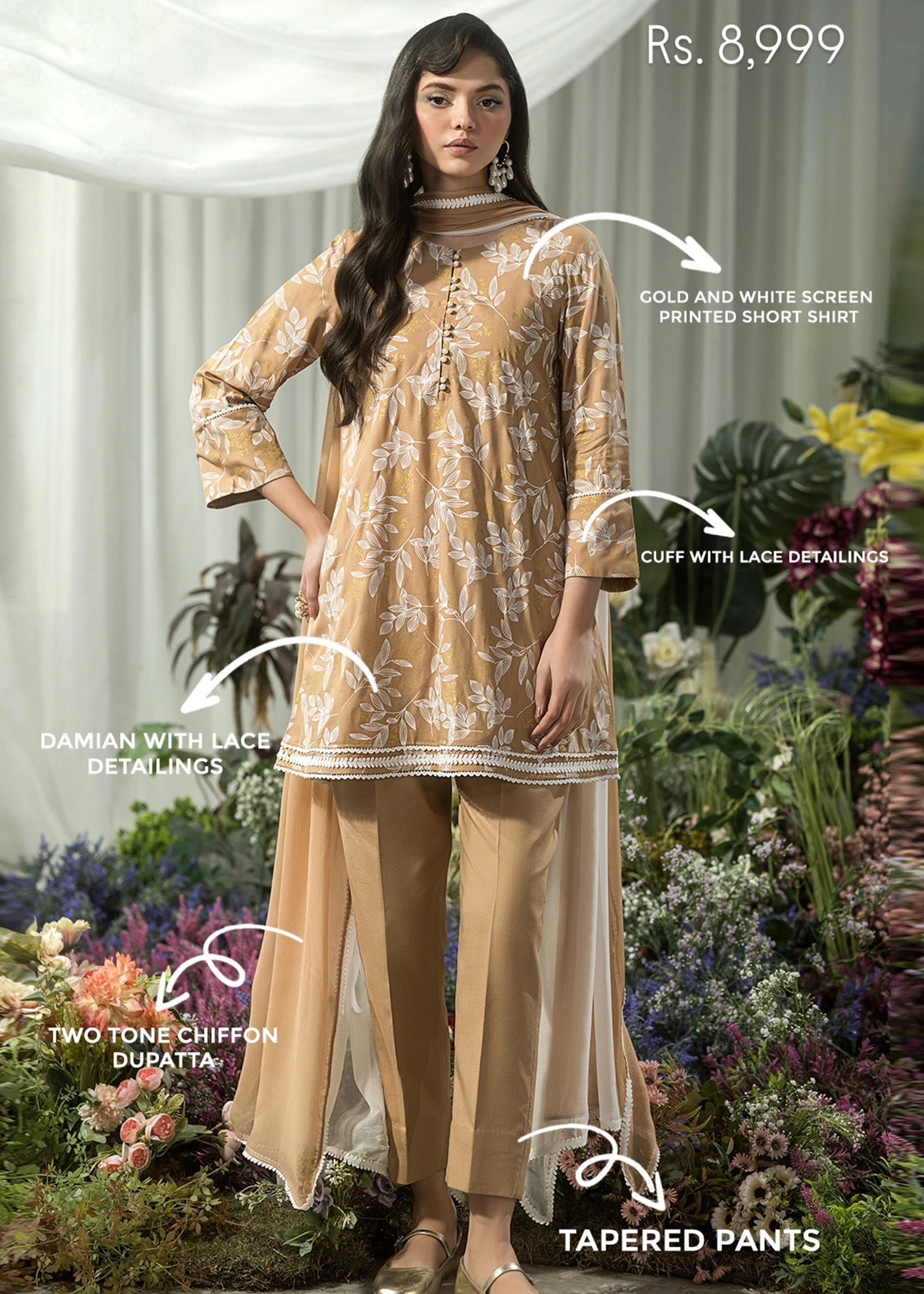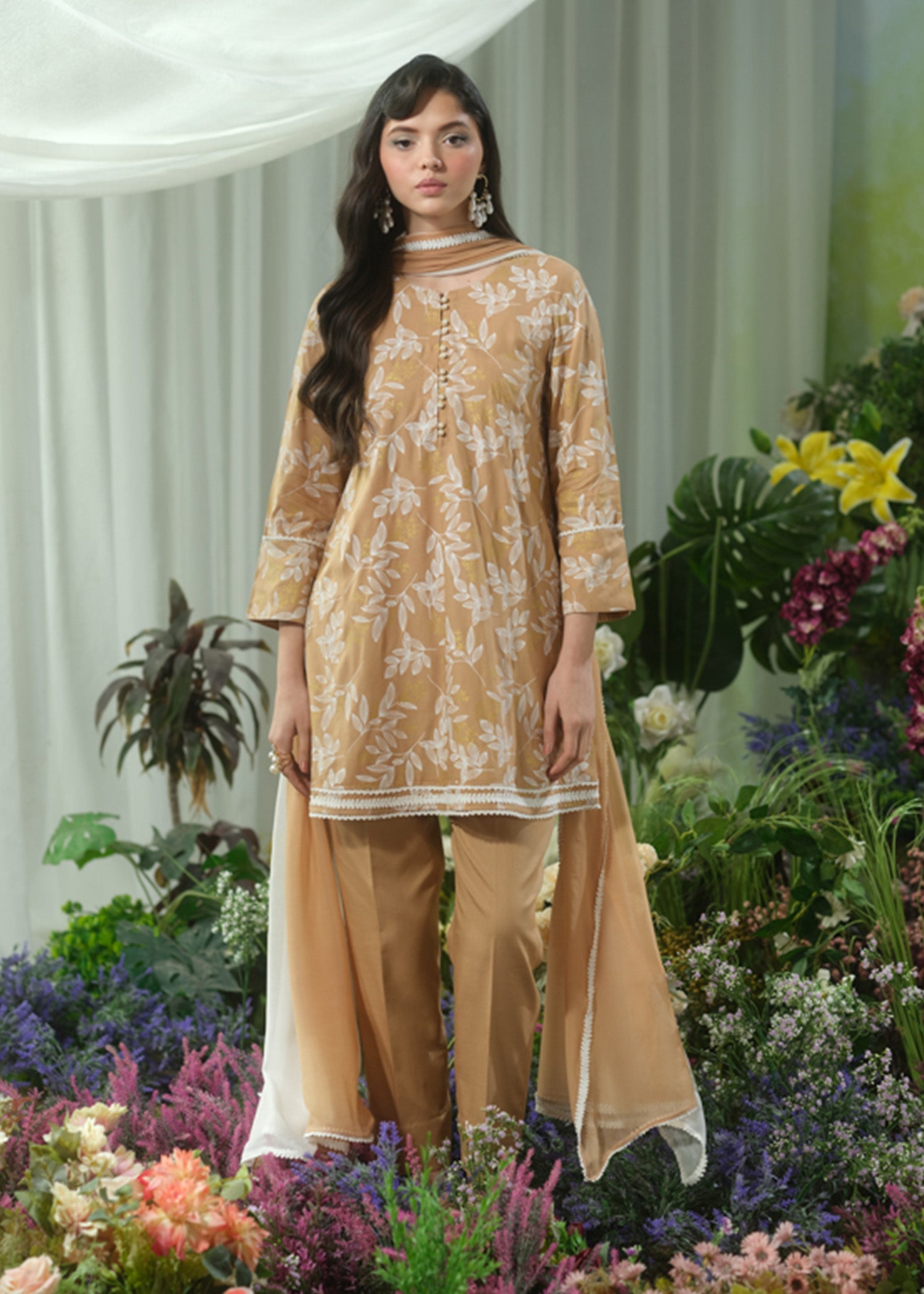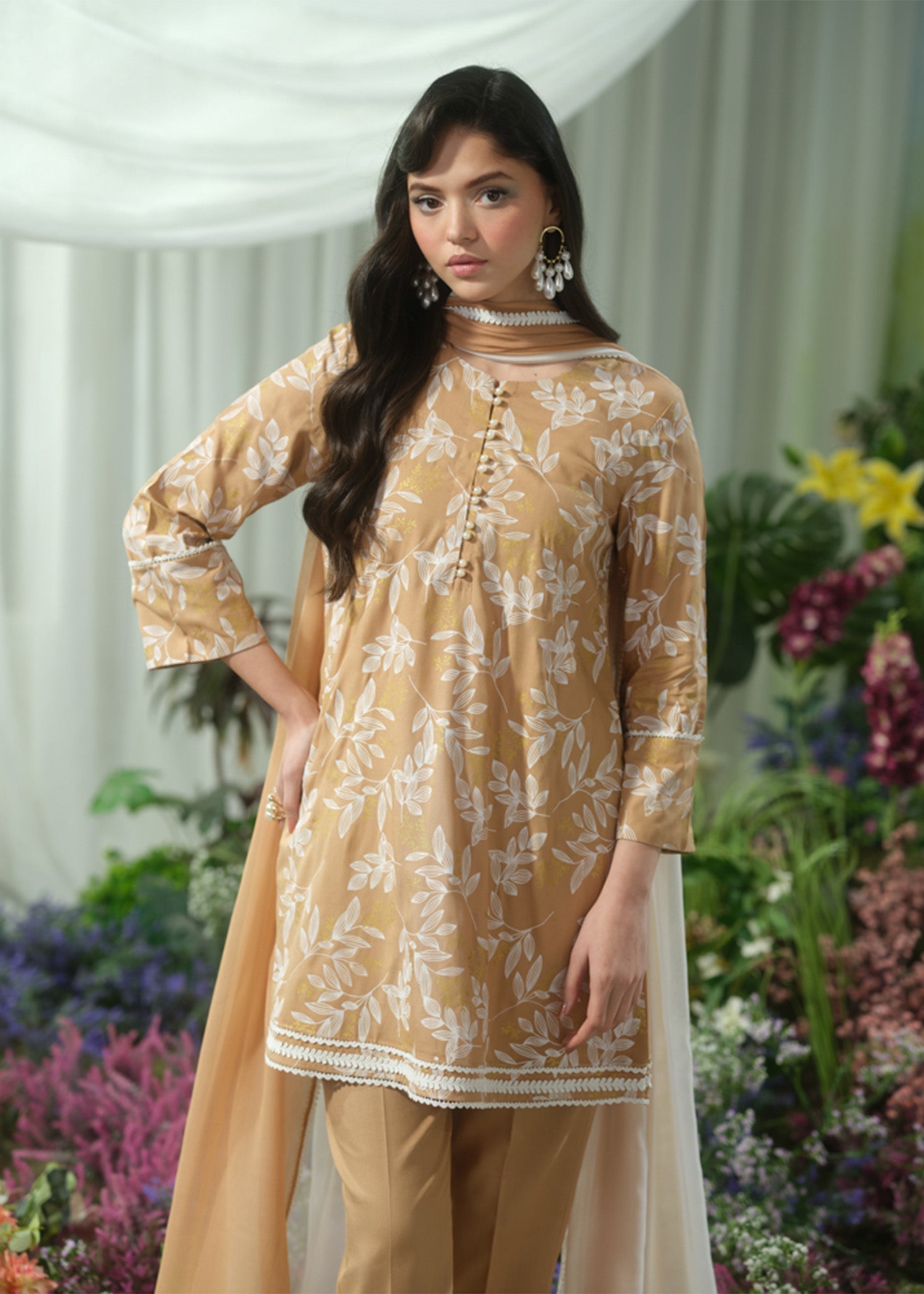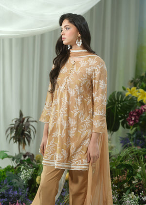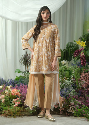 This elegant beige short shirt features intricate screen printing and is beautifully accented with delicate lace trimmings along the edges. The shirt is paired with chic, tapered pants for a contemporary silhouette. To complete the look, the ensemble comes with a two-tone dupatta, adding a soft contrast and an air of sophistication to the overall design. Perfect for a stylish yet comfortable look, ideal for a variety of occasions.