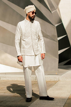 Introducing Dalbir — a striking white sherwani in self-patterned cotton silk, featuring a refined chevron design in resham and adda work across the front. Layered over a cotton silk kurta with subtle resham embroidery on the sleeves, and paired with wide trousers, this ensemble exudes an artisanal touch.