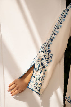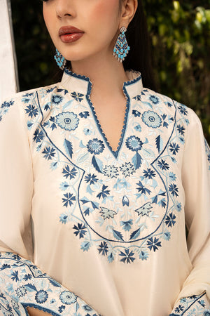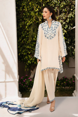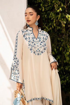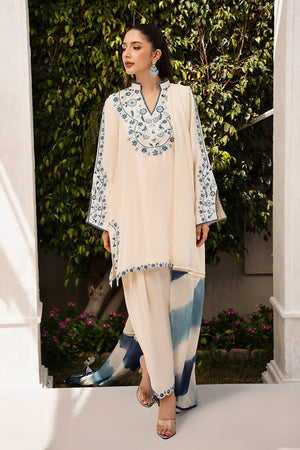 Ivory short shirt in pure raw silk, paired with a narrow shalwar. The shirt is embroidered in shades of blue, creating a subtle contrast against the ivory fabric. The medium-weight silk dupatta is designed with a tie-dye effect on the pallu, in varying shades of blue, adding a contemporary touch to the traditional design.