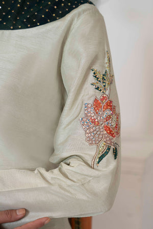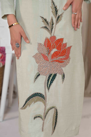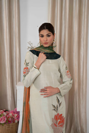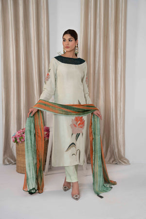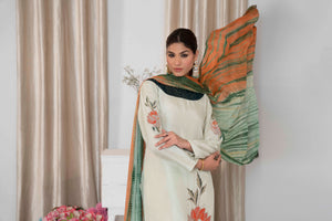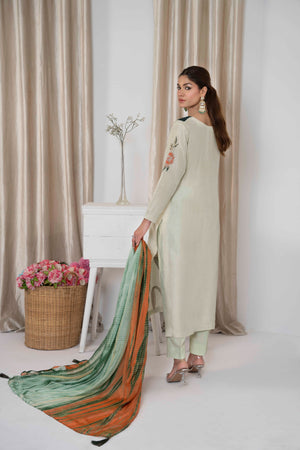 Striking details of applique organza and delicate embellishment of sequins and stones. Dania is a vision to be hold created on a pastel green canvas, complimented by a silk tie and dye dupatta. Trousers included.