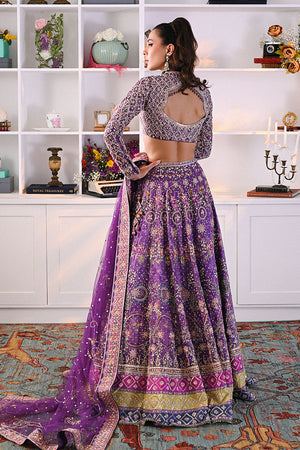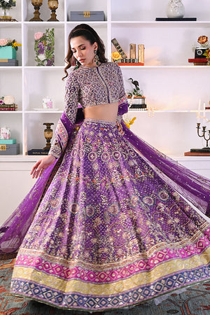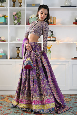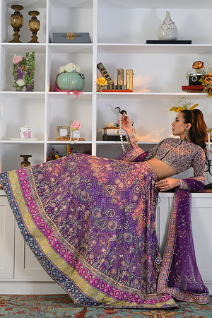 Handcrafted to perfection is our Raw Silk Purple Digital Printed Lehenga, featuring bold color-blocked chunri borders that elevate its traditional charm. The matching choli, adorned with an intricate all-over jaal, showcases a jewel neckline, an elegant back cutout, and exquisite cutwork detailing on the sleeves. Handcrafted to perfection, this ensemble is embellished with multicolor Swarovski stones, moti, a variety of sequins, gota, and katdana, creating a dazzling visual appeal. The look is completed with a stiff net dupatta, adorned with linear sparkly motifs and chatta patti borders, adding the final touch of sophistication to this sparkling outfit.