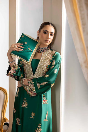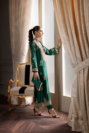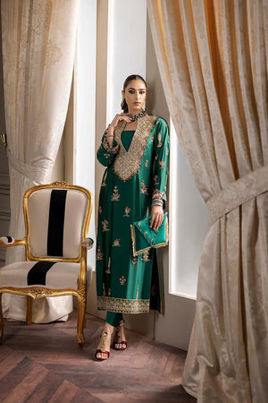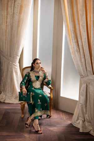 Long silk shirt embellished with crystals sequins and nakshi paired with silk trousers.