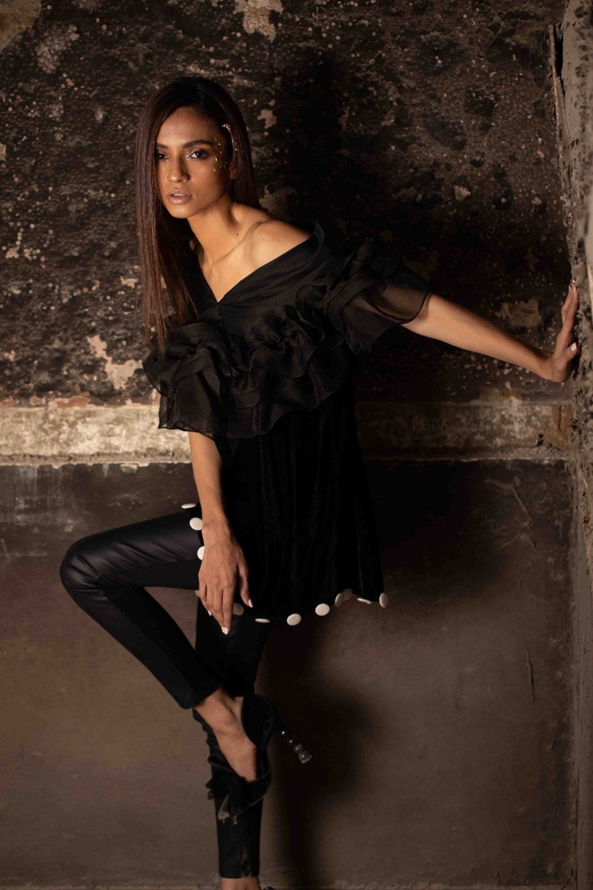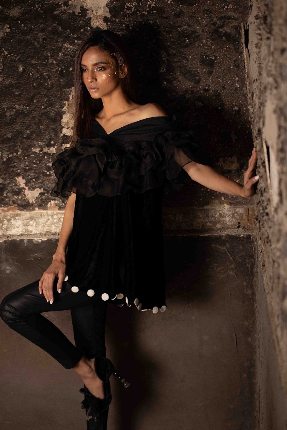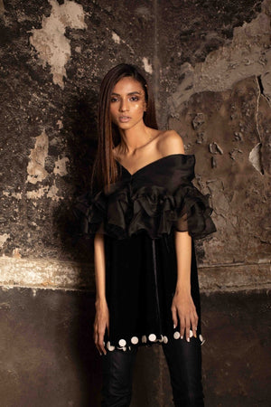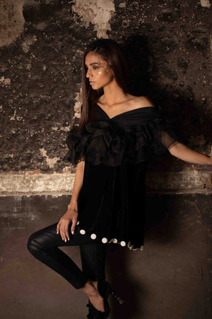 Valvet tunic with a pure organza ruffle shoulder. Finished at the bottom with contrasting handmade buttons.Fabric: Velvet