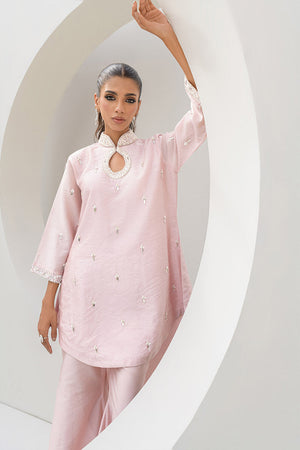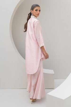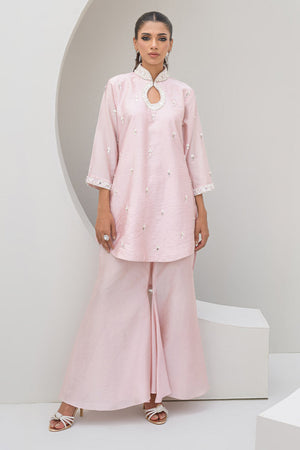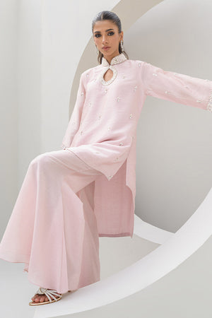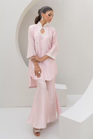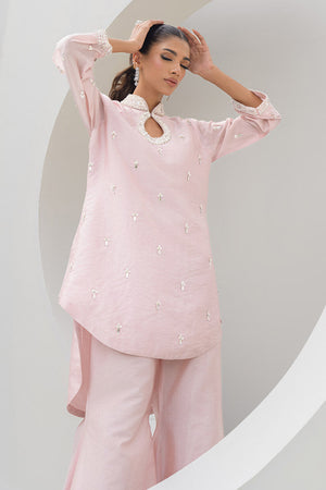 This elegant high-low coord set is made from pure silk canvas. The neckline and sleeves are beautifully adorned with handwork featuring pearls and crystals. It comes with stylish peplum pants for a chic finish. The model is wearing a size small, with the shirt measuring 34 inches in the front and 41 inches in the back. Please note that this design has a loose cut, so sizes may vary from the standard size chart.