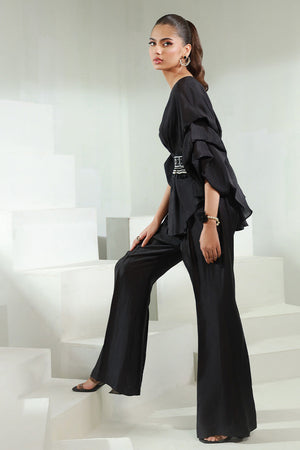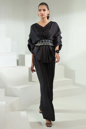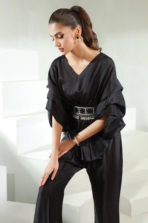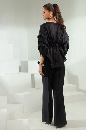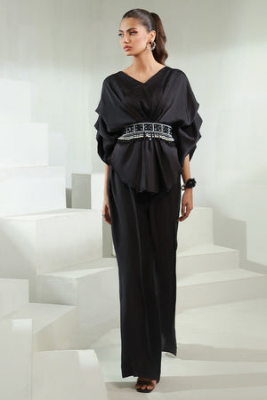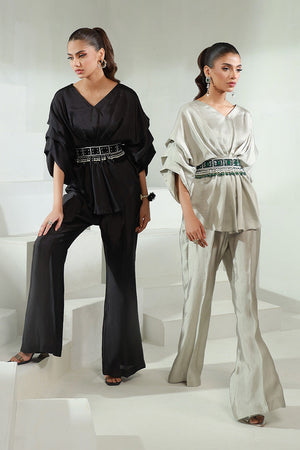 Crafted in premium sheesha silk, this butterfly cut cape exudes elegance and sophistication. The design's allure and distinctive cut make a statement on their own. It comes with a meticulously handcrafted black and white belt adorned with hanging pearl details. Paired with boot-cut pants, this ensemble serves as the ideal outfit for any party or event, guaranteed to capture everyone's attention.